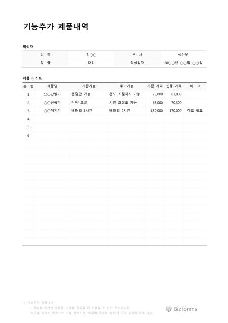 기능추가제품내역입니다. 기능을 추가한 제품 내역을 작성할 때 사용할 수 있는 문서입니다.