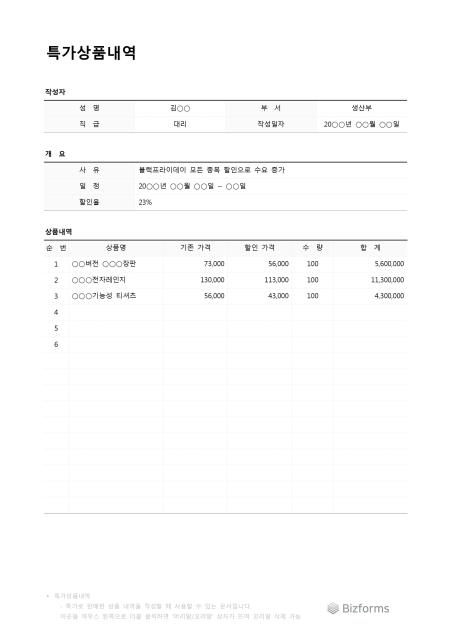 특가상품내역입니다. 특가로 판매할 상품 내역을 작성할 때 사용할 수 있는 문서입니다.