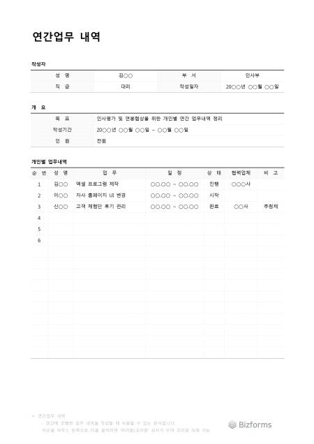 연간업무내역입니다. 연간에 진행한 업무 내역을 작성할 때 사용할 수 있는 문서입니다.