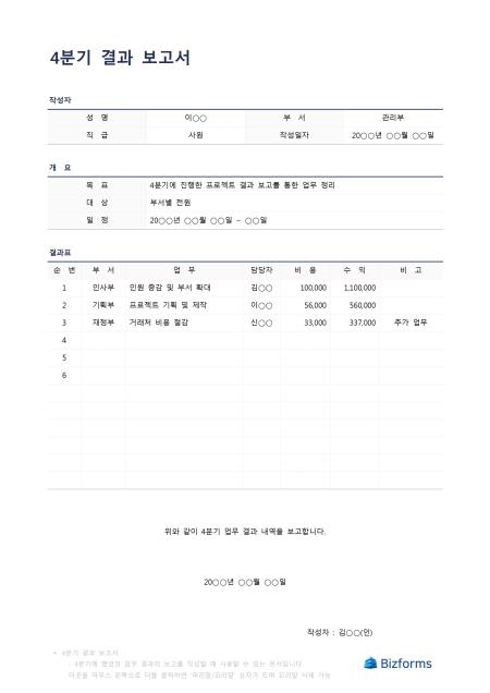 4분기결과보고서입니다. 4분기에 시행한 업무의 결과 보고서를 작성할 때 사용할 수 있는 문서입니다.