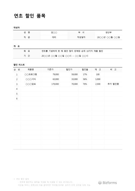 연초할인품목입니다. 연초에 할인하는 품목을 작성할 때 사용할 수 있는 문서입니다.