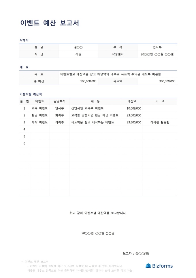 9,000원/월이벤트예산보고서입니다. 이벤트를 진행할 예산 보고서를 작성할 때 사용할 수 있는 문서입니다.