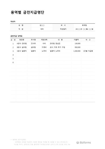 용역별금전지급명단입니다. 용역별로 금전을 지급한 리스트를 작성할 때 사용할 수 있는 문서입니다.