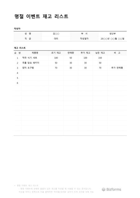 명절이벤트재고리스트입니다. 명절에 실시했었던 이벤트의 재고 리스트를 작성할 때 사용할 수 있는 문서입니다.