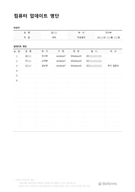 컴퓨터업데이트명단입니다. 컴퓨터를 업데이트 해놓은 명단표를 작성할 때 사용할 수 있는 문서입니다.