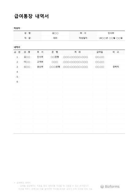 급여통장내역서입니다. 급여를 받을 직원들 통장 내역서를 작성할 때 사용할 수 있는 문서입니다.