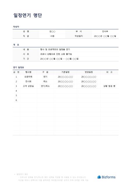 일정연기명단입니다. 일정을 연기하거나 취소한 내역 명단을 작성할 때 사용할 수 있는 문서입니다.