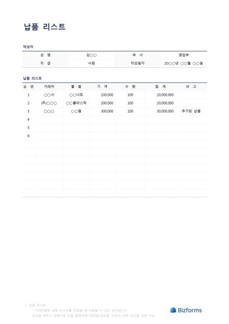 납품리스트입니다. 거래처별로 납품할 리스트를 작성할 때 사용할 수 있는 문서입니다.