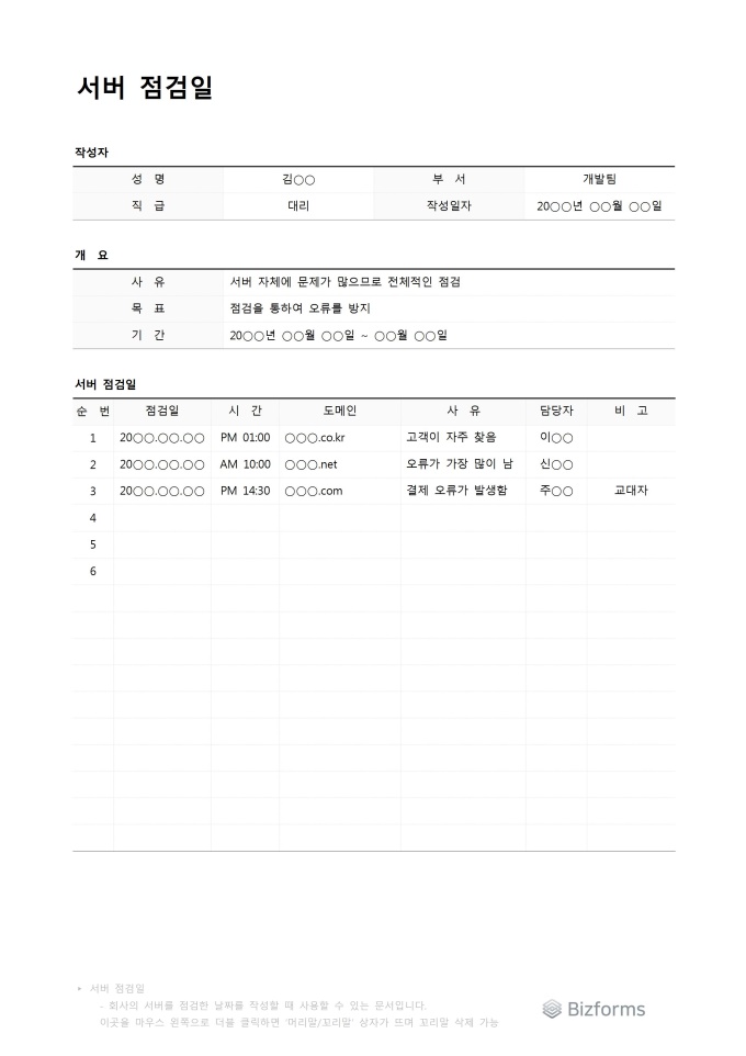 9,000원/월서버점검일입니다. 사내에서 사용하는 서버의 점검일을 작성할 때 사용할 수 있는 문서입니다.