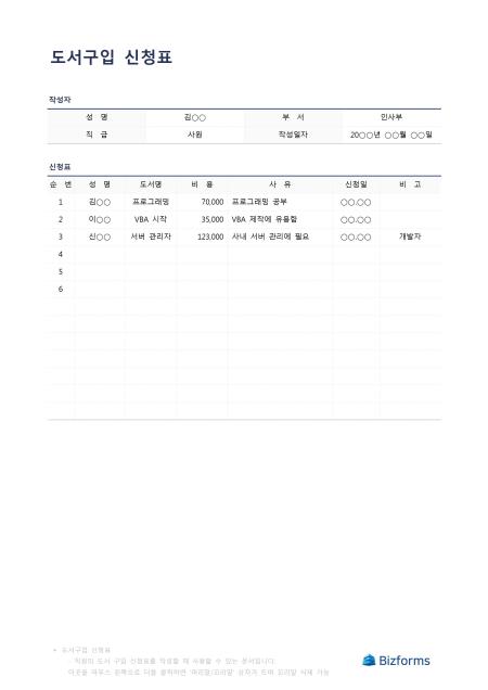 도서구입신청표입니다. 사내에 직원들이 도서 구입 신청표를 작성할 때 사용할 수 있는 문서입니다.