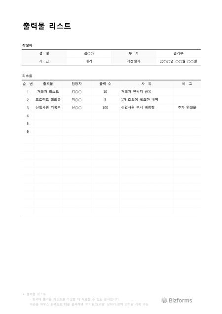 출력물리스트입니다. 출력한 문서 리스트를 작성할 때 사용할 수 있는 문서입니다.