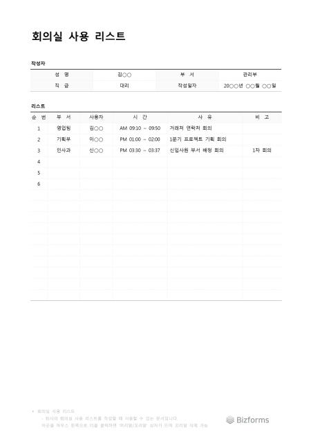 회의실사용리스트입니다. 회의실을 사용한 리스트를 작성할 때 사용할 수 있는 문서입니다.