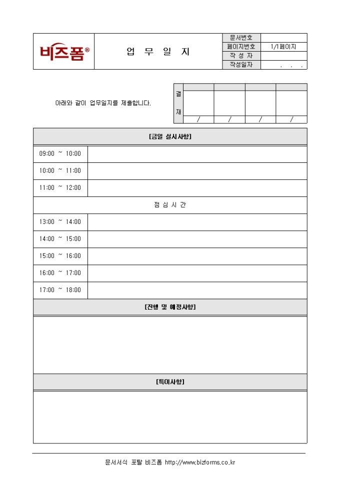 9,000원/월하루 일과중 작업했던 내용을 작성할때 사용합니다. 구성요소는 금일실시사항, 진행및예정사항, 특이사항으로 구성되어 있으며 작성후 해당 부서장에게 제출하여 승인을 얻어야 합니다.