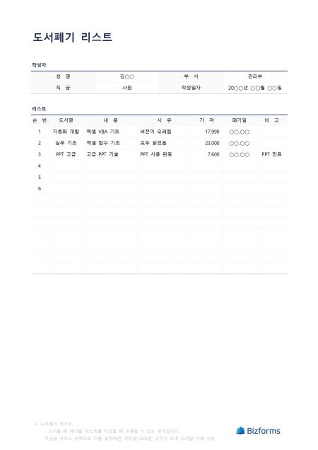 도서폐기리스트입니다. 도서물 중 폐기할 리스트를 작성할 때 사용할 수 있는 문서입니다.