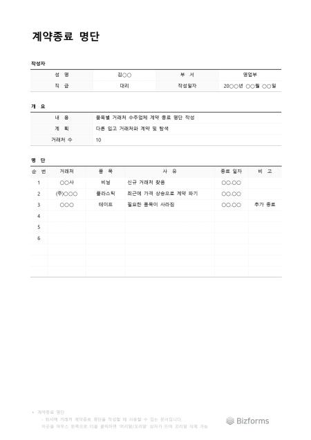 계약종료명단입니다. 계약이 끝나서 종료된 거래처 명단을 작성할 때 사용할 수 있는 문서입니다.