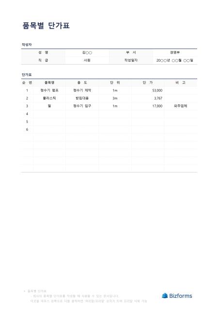 품목별단가표입니다. 회사의 품목별 단가표를 작성할 때 사용할 수 있는 문서입니다.