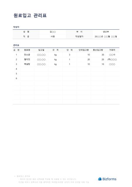 원료입고관리표입니다. 회사의 입고된 원료내역 표를 작성할 때 사용할 수 있는 문서입니다.
