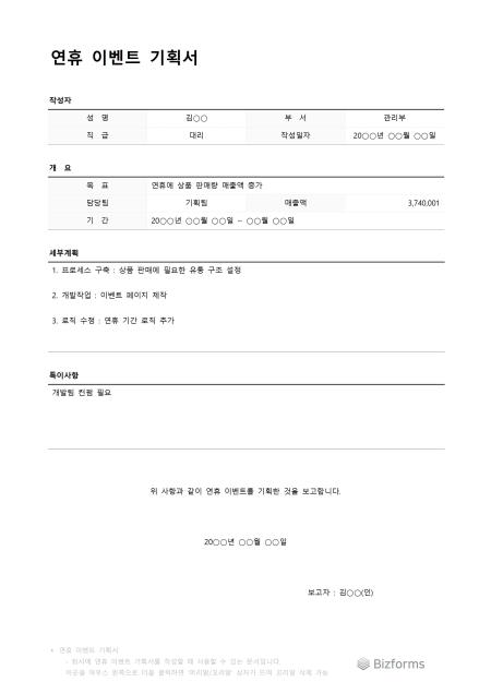 연휴이벤트기획서입니다. 연휴에 진행할 이벤트 기획서를 작성할 때 사용할 수 있는 문서입니다.