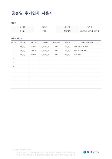 공휴일추가연차사용자입니다. 공휴일에 추가적으로 연차를 사용한 인원 내역을 작성할 때 사용할 수 있는 문서입니다.