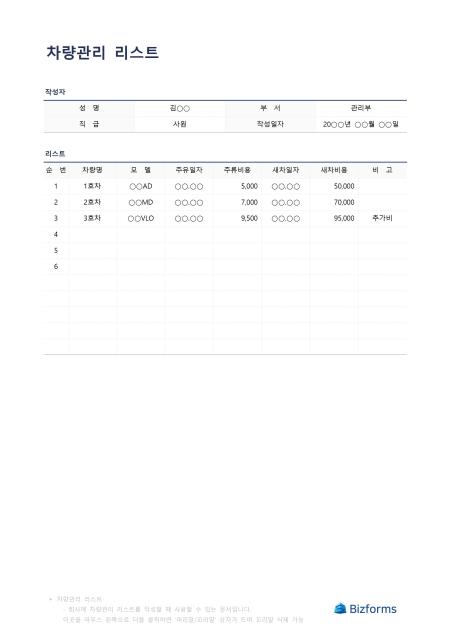 차량관리리스트입니다. 차량을 관리한 리스트를 작성할 때 사용할 수 있는 문서입니다.