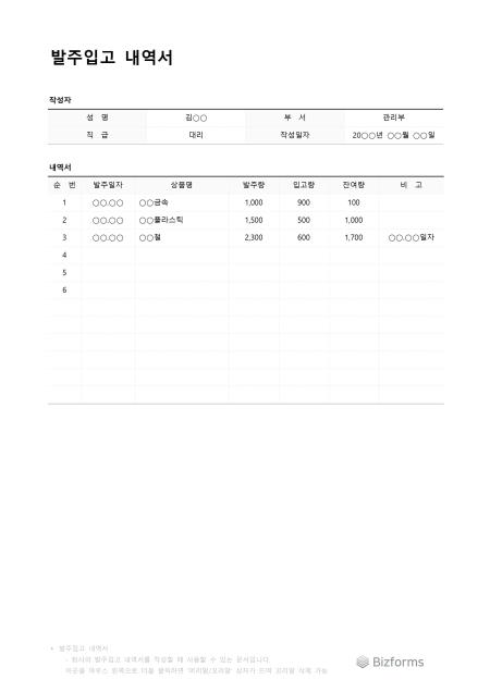 발주입고내역서입니다. 발주량과 입고량을 확인하여 내역서를 작성할 때 사용할 수 있는 문서입니다.