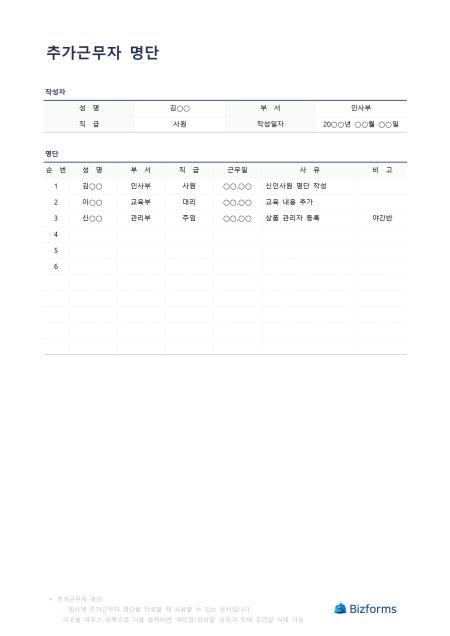 추가근무자명단입니다. 추가근무하는 직원 명단을 작성할 때 사용할 수 있는 문서입니다.