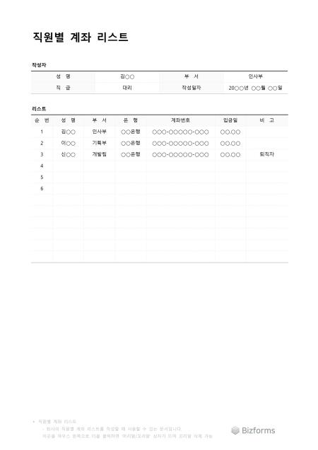 직원별계좌리스트입니다. 직원별로 계좌 리스트를 작성할 때 사용할 수 있는 문서입니다.
