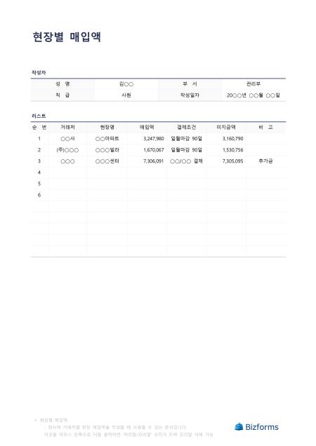 현장별매입액입니다. 현장별로 매입한 금액 내역을 작성할 때 사용할 수 있는 문서입니다.