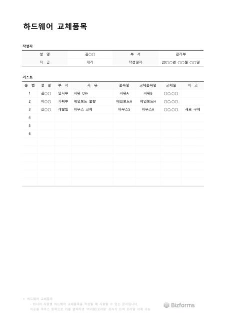 하드웨어교체품목입니다. 하드웨어를 사용자별로 교체한 품목 내역을 작성할 때 사용할 수 있는 문서입니다.