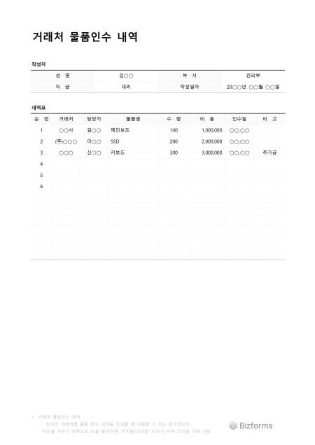 거래처물품인수내역입니다. 거래처별로 물품을 인수한 내역을 작성할 때 사용할 수 있는 문서입니다.