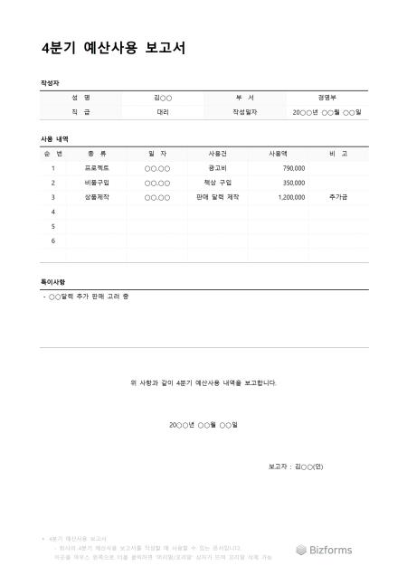 4분기예산사용보고서입니다. 4분기에 사용한 예산내역 보고서를 작성할 때 사용할 수 있는 문서입니다.