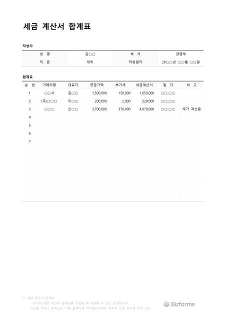 세금계산서합계표입니다. 공급가액, 부가세, 세금계산서 합계표를 작성할 때 사용할 수 있는 문서입니다.