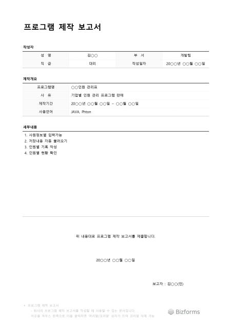 프로그램제작보고서입니다. 프로그램을 제작하기 전 보고서를 작성할 때 사용할 수 있는 문서입니다.