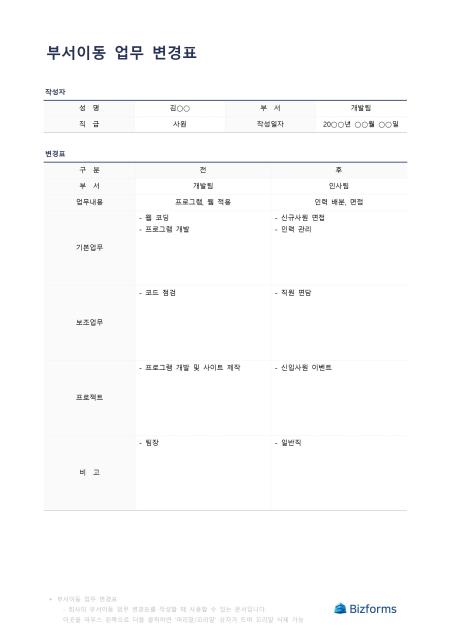 부서이동업무변경표입니다. 부서이동 후 변경된 업무 변경표를 작성할 때 사용할 수 있는 문서입니다.