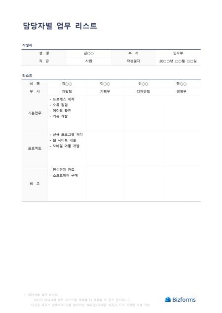 담당자별업무리스트입니다. 담당자별로 업무 리스트를 작성할 때 사용할 수 있는 문서입니다.