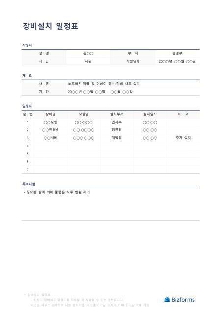 장비설치일정표입니다. 사내에 장비를 설치한 일정표를 작성할 때 사용할 수 있는 문서입니다.