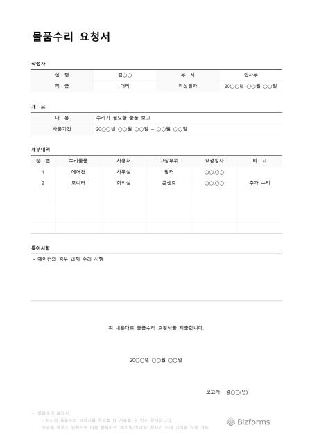 물품수리요청서입니다. 물품 수리를 위해서 요청서를 작성할 때 사용할 수 있는 문서입니다.