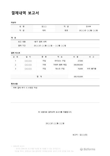 결제내역보고서입니다. 결제한 내역 보고서를 작성할 때 사용할 수 있는 문서입니다.