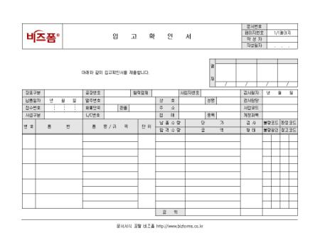 입고내용을 확인할 수 있는 양식으로, 납품수량, 합격수량, 불량코드, 판정코드 등의 항목으로 구성되어 있으며 담당자에게 확인하여 제출합니다.