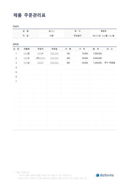 제품주문관리표입니다. 제품을 주문한 관리표를 작성할 때 사용할 수 있는 문서입니다.