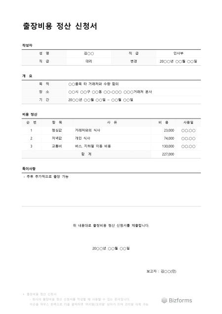 출장비용정산신청서입니다. 출장 후 비용 정산 신청서를 작성할 때 사용할 수 있는 문서입니다.