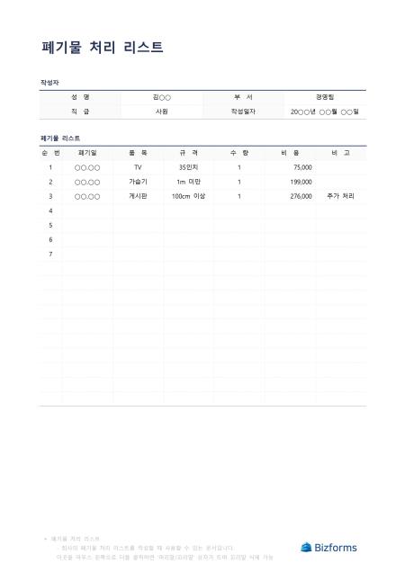 폐기물처리리스트입니다. 폐기물을 처리한 리스트를 작성할 때 사용할 수 있는 문서입니다.