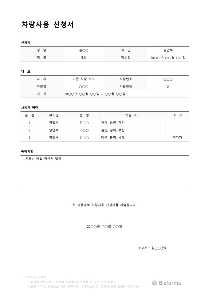 차량사용신청서입니다. 차량을 사용하고자 신청서를 작성할 때 사용할 수 있는 문서입니다.
