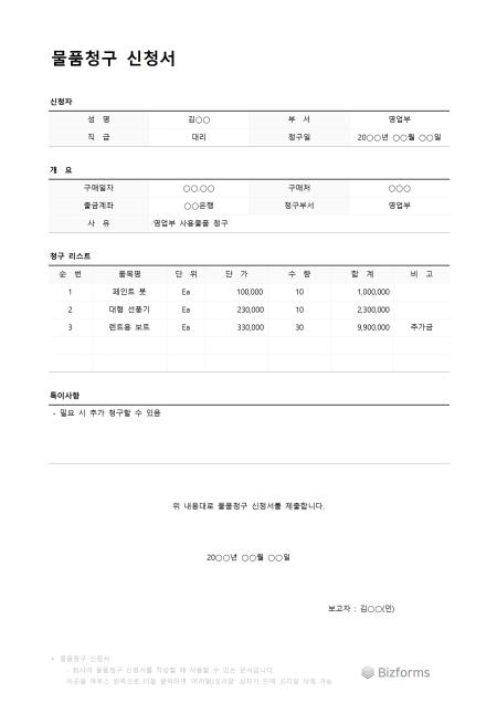 물품청구신청서입니다. 물품을 청구한 신청서를 작성할 때 사용할 수 있는 문서입니다.