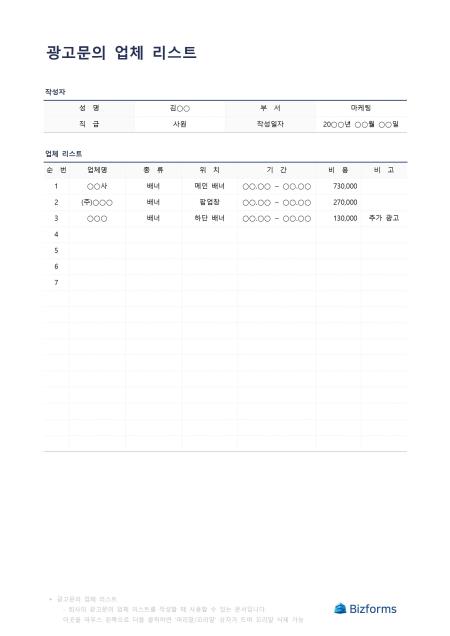 광고문의업체리스트입니다. 광고문의가 들어온 업체 리스트를 작성할 때 사용할 수 있는 문서입니다.