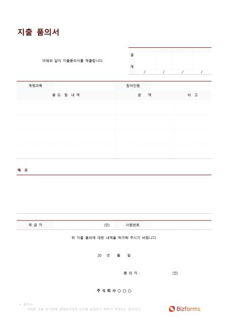 지출품의의 대한 내역을 작성 할 수 있는 품의서 양식입니다. 계정과목, 참석인원, 용도 및 내역, 금액 등의 항목으로 구성되어 있으며 담당자에게 제출합니다.