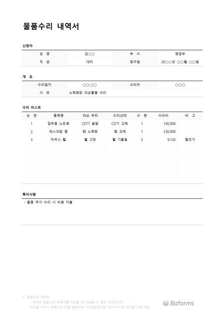 물품수리내역서입니다. 물품을 수리한 내역서를 작성할 때 사용할 수 있는 문서입니다.