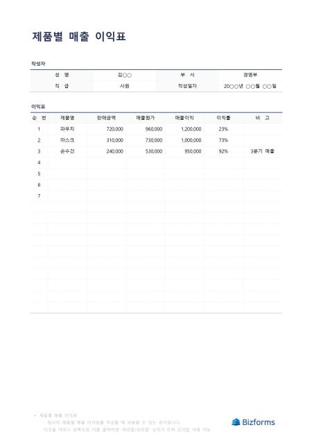 제품별매출이익표입니다. 제품별로 매출 이익표를 작성할 때 사용할 수 있는 문서입니다.