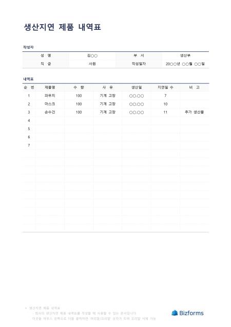 생산지연제품내역표입니다. 생산지연 제품 내역표를 작성할 때 사용할 수 있는 문서입니다.