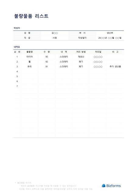 불량물품리스트입니다. 불량 처리된 물품 리스트를 작성할 때 사용할 수 있는 문서입니다.